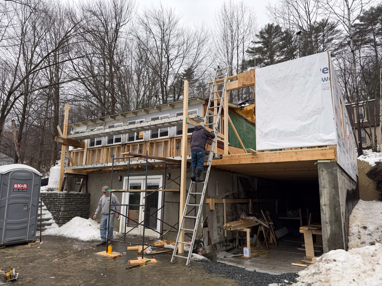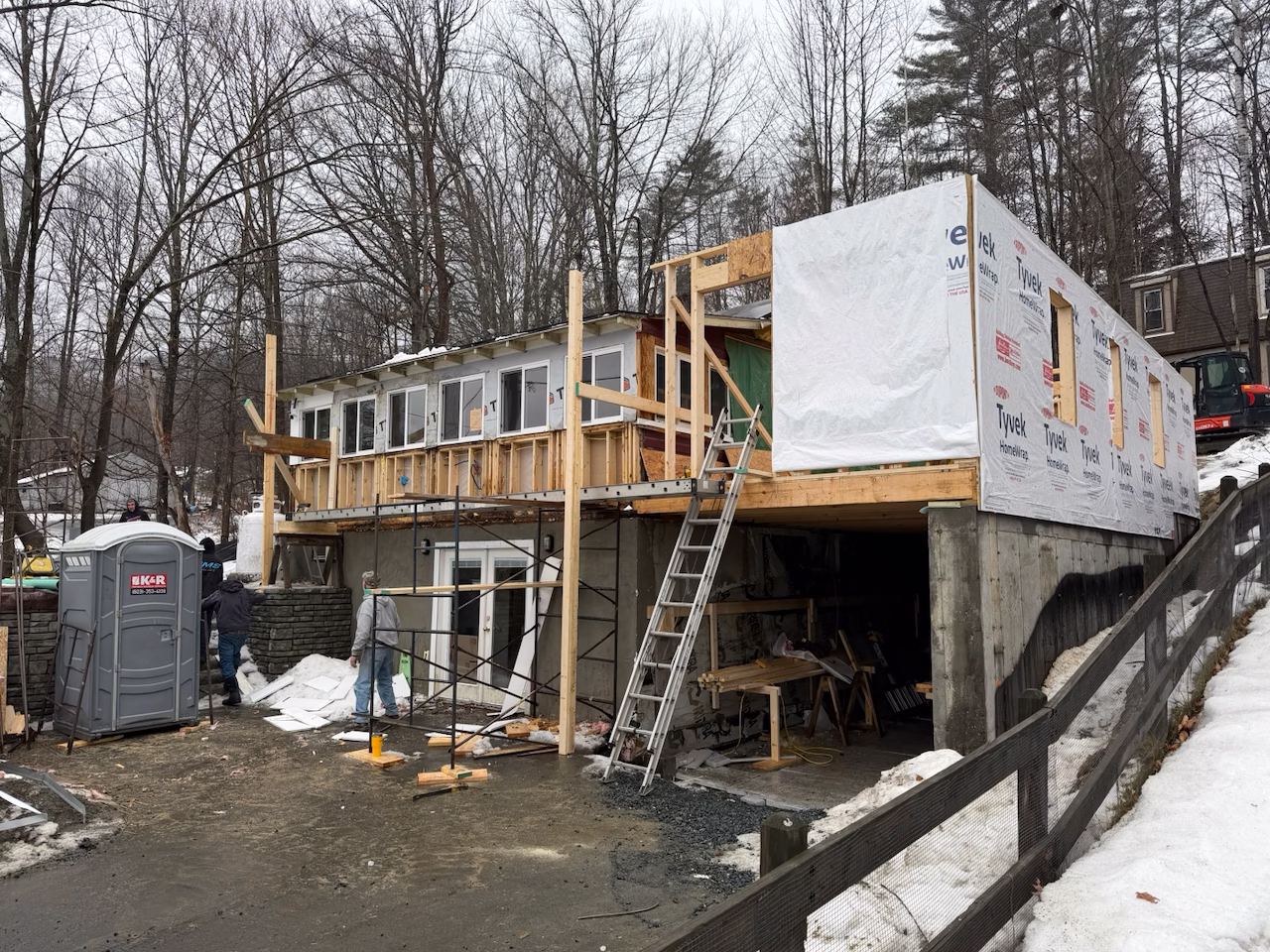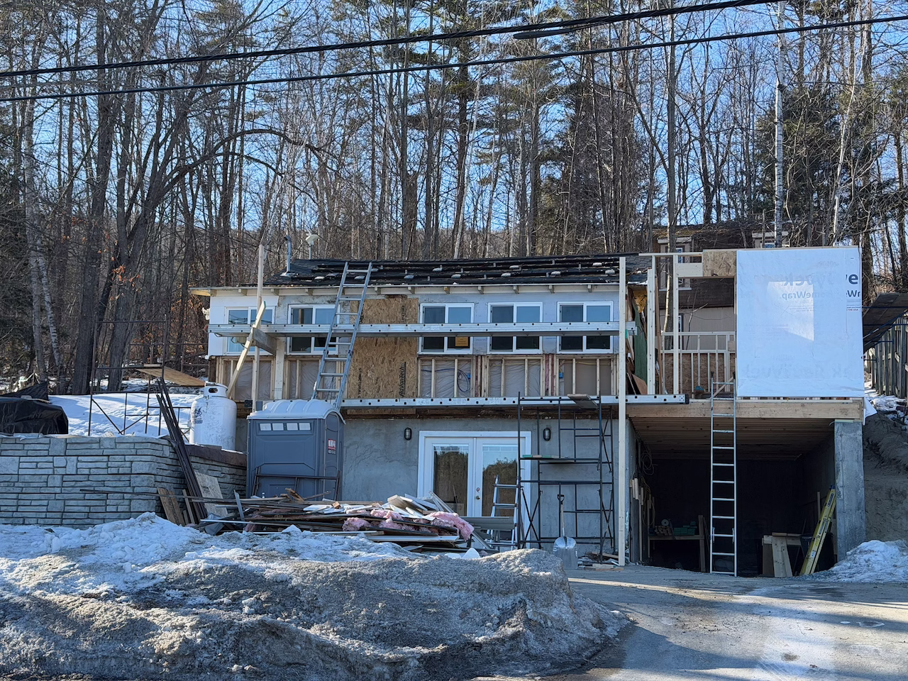 - Demo started on the front half of the existing house and a fake wall was put up to hold in heat for a bit and the elements