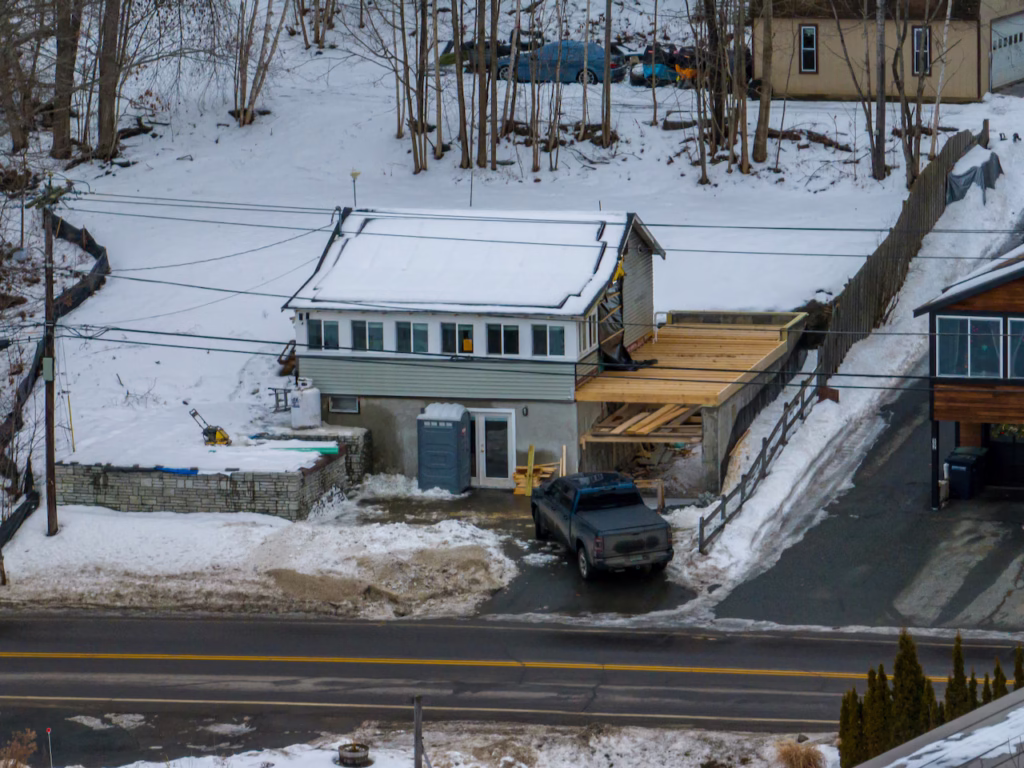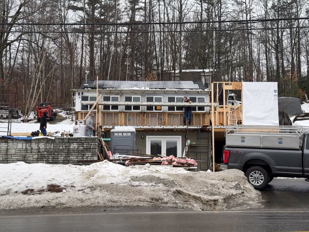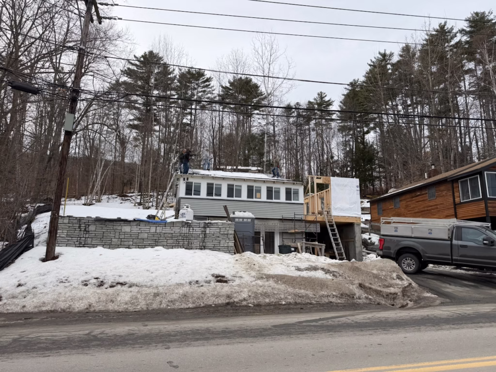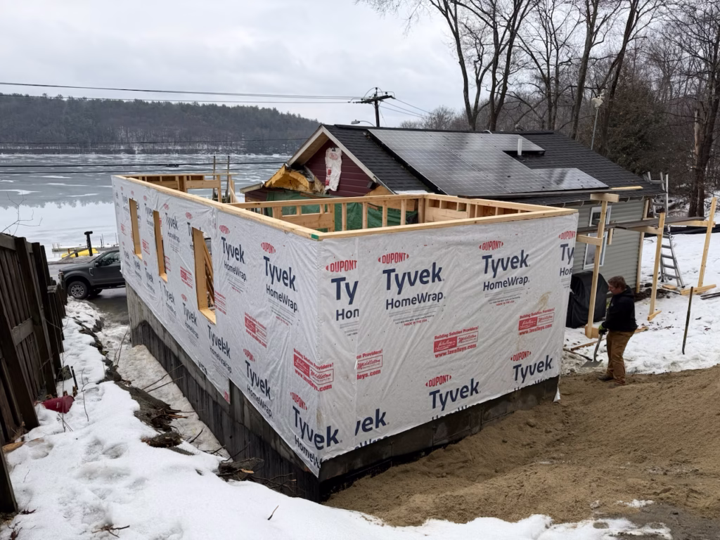 - Demo started on the front half of the existing house and a fake wall was put up to hold in heat for a bit and the elements