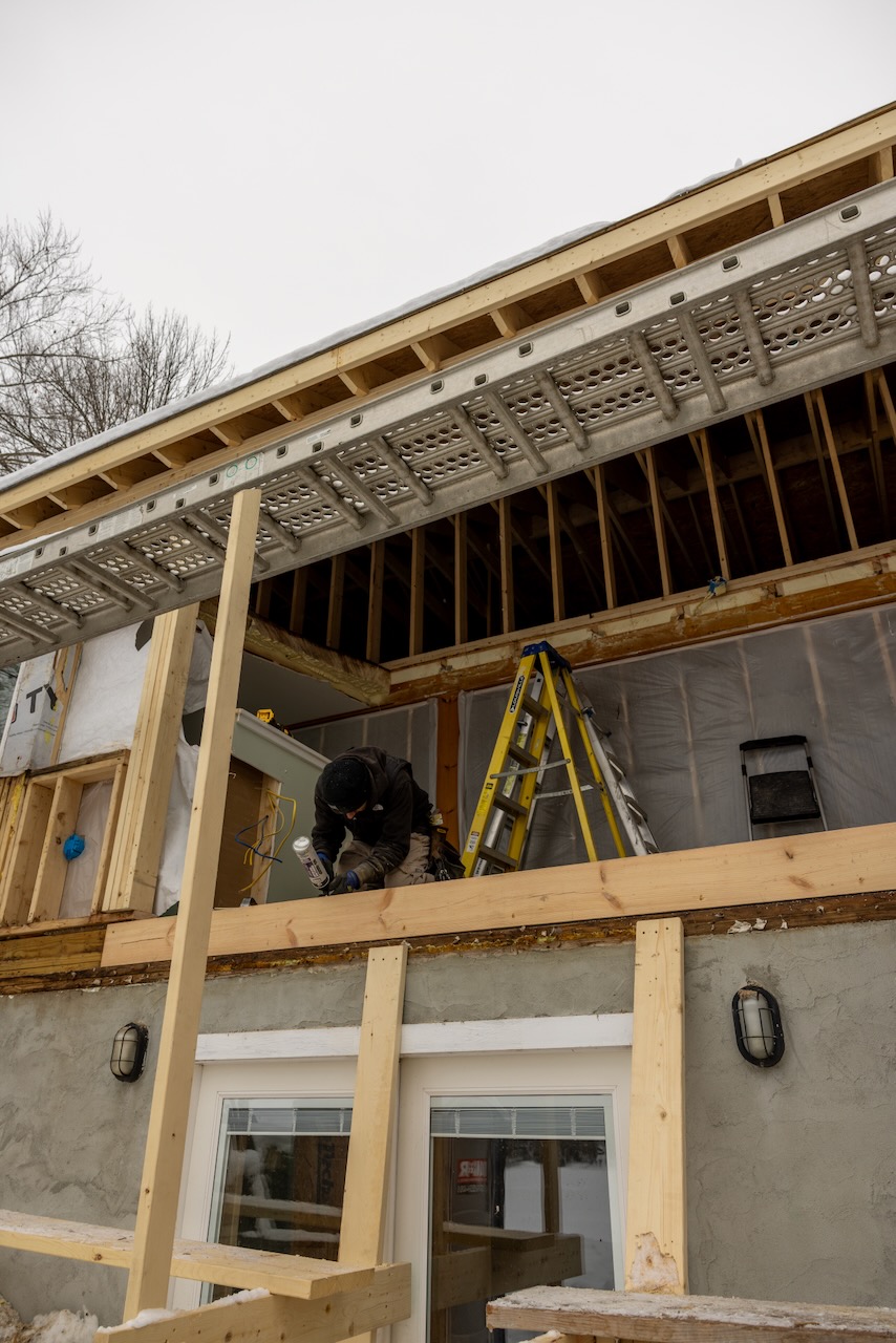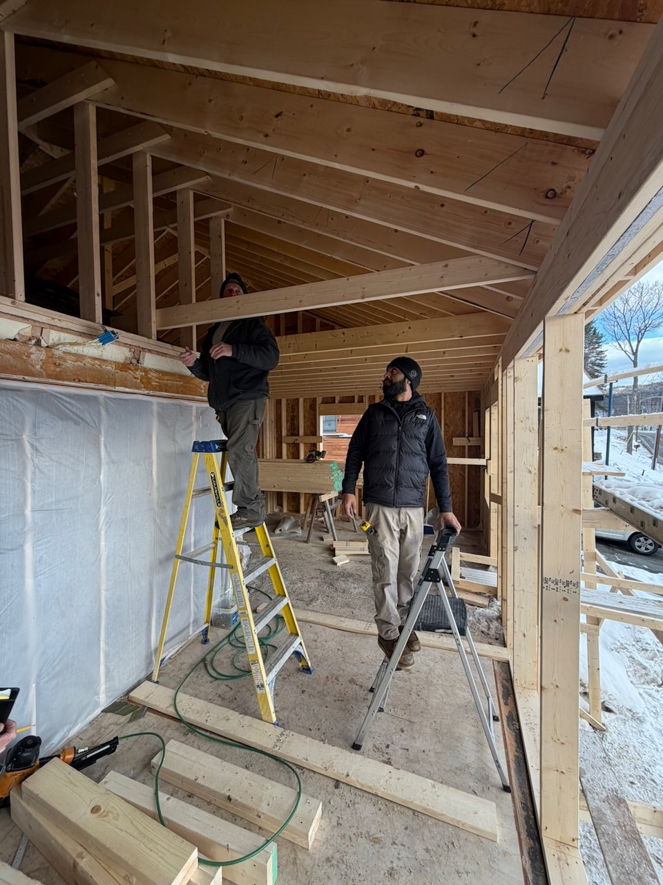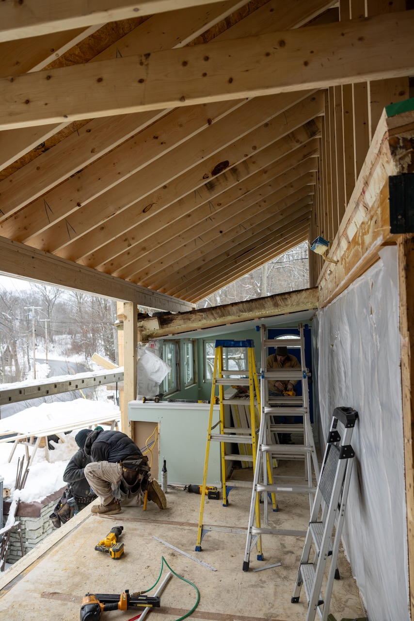 We realized a few weeks ago that since we’re doing a stick-built roof, we can do something more custom so we initially pushed for 8′ ceiling from 7′ which is what we initially specified. but once we realized we could go higher, we did! Here’s the crew showing collar ties at 9 feet versus 10.5′ at the front of the house and we went with the higher amount since it’d only cost $250 more to do that with most of that being drywall costs.